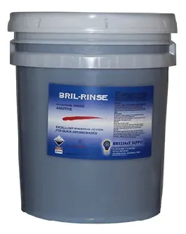 "Bril-Rinse" Rinse Aid & Hard Water Spot Remover 5 Gal Pail (Aprox 6000 washes per pail) Best used with Low Temperature Machines. Bril- Rinse is a high active rinse additive designed for use in industrial and institutional machine warewashing operations. Highly concentrated surfactants facilitate the rapid dispersal and sheeting of rinse water from glasses, cutlery, flatware, glasses, and dishware so you can avoid unsightly spotting on your tableware. Ideal for all soil loads and water hardness conditions, Bril-Rinse speeds the drying time while leaving dishware clean and spot free.