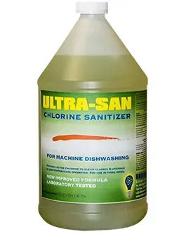 Ultra San is the perfect product for the value-oriented customer. This product's 2 gallon pack is going to save you space and upfront cost. This highly concentrated sanitizer is designed for low temperature dish machines in water temperatures ranging from 120-160 degrees. Just hook up this product into your commercial dish machine and let it go to work for you. Recommended Sanitizing level is at 50-100 PPM. Single gallons are great for bar washers or kitchens with limited room.